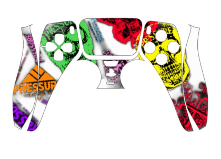 This PS5 controller skin features a vibrant and graffiti-inspired design! It's got a cool mix of colors and graphics, including stylized skulls in green and yellow on the hand grips. You'll also see the word "PRESSURE" incorporated into the design in different fonts and colors, like orange and purple. The central part of the skin has a more abstract, almost splattered look with red and black. It's a great way to give your controller a unique and edgy look! Let me know if you have any other questions. š