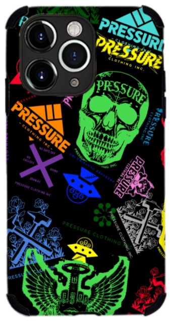 This iPhone case features a vibrant and edgy design with a black background covered in a collage of colorful graphics. You'll see a bright green skull prominently displayed, along with the word "PRESSURE" repeated in various fonts and orientations. Other eye-catching elements include abstract shapes, floral designs, and what appears to be a winged electric guitar. The overall style is bold, energetic, and definitely makes a statement!