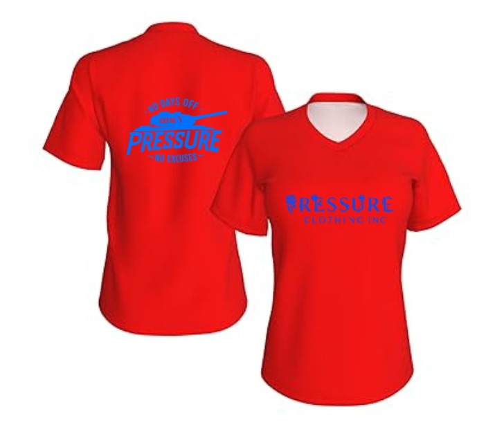 Turning to the back of the shirt, the same "PRESSURE" design is featured prominently, this time with the words "NO DAYS OFF" arched above it and "NO EXCUSES" written below. The blue ink really pops against the red fabric, making the text stand out. It seems like a casual and sporty style of shirt.