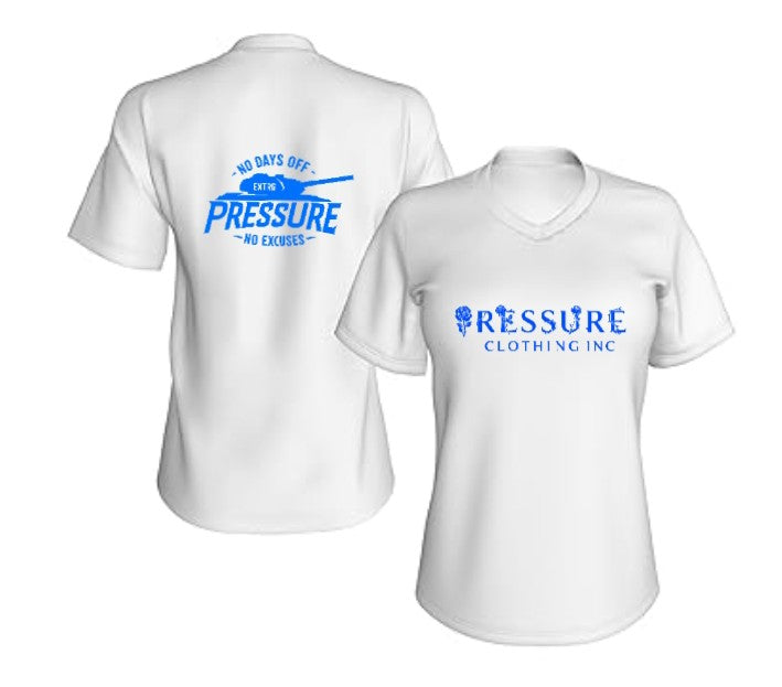 The back of the shirt also has a blue design. It displays the words "NO DAYS OFF" at the top, followed by a graphic that looks like a tank or armored vehicle. Below the graphic is the word "PRESSURE" in the same stylized blue font as the front, and underneath that, in a smaller font, are the words "-NO EXCUSES-".