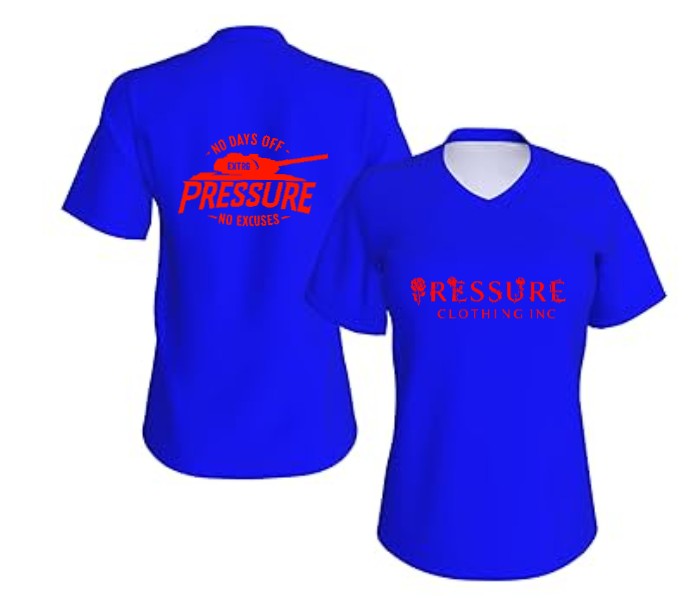 This is a blue V-neck t-shirt. On the front, in red lettering, it says "PRESSURE" with "CLOTHING INC" underneath in smaller letters.